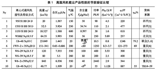 (3)北京風機二廠生產(chǎn)的用于水泥窯尾高溫風機單、雙吸4個系列,其中WDHZ型系列單吸高溫(載塵)風機[3],其性能節(jié)能驗證比較見表1。